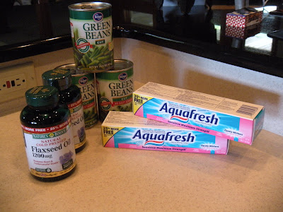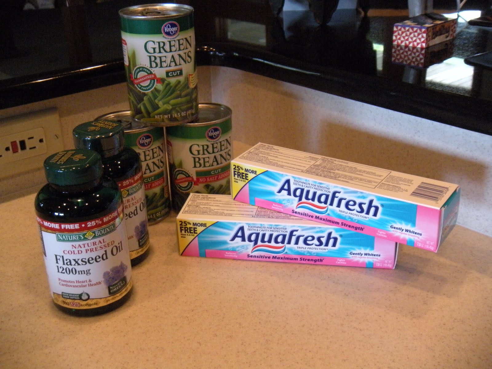 The flaxseed oil was buy one get one and I had a coupon for $1.50, the green beans were on sale for .63 a can and the Aquafresh was nearly a dollar off and I had a dollar coupon.