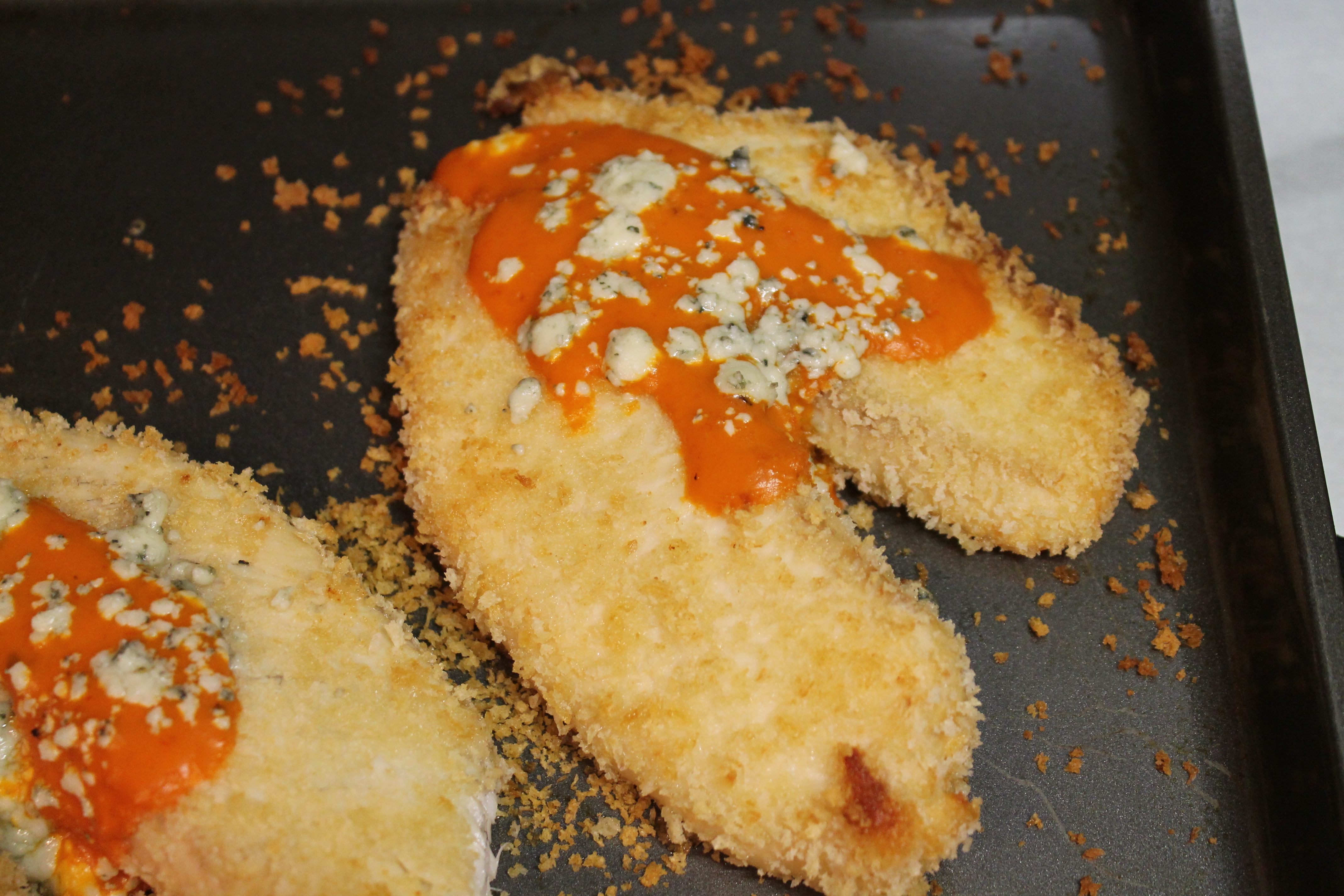 Heat oven to 375. Rinse fish and pat dry. Place fillets in a shallow dish and drizzle with olive oil, coating fish evenly. Place panko crumbs in another shallow dish and dredge fish well; sprinkle with salt. Place on a rimmed baking sheet or dish. Bake 12 minutes and remove pan from oven. Flip fish carefully to brown the other side. Before returning to oven, spoon some Buffalo sauce over each piece and sprinkle with 1 tsp. to 1 Tbsp. blue cheese crumbles. Return to oven and cook until fish just flakes, 10 or 15 minutes depending on thickness of fillets.